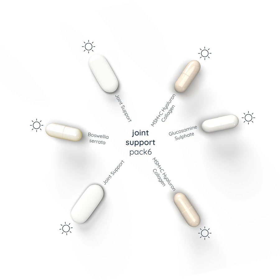 2 tablettát és 4 kapszulát tartalmazó étrend-kiegészítő glükozamin-szulfát-, kondroitin-szulfát-, MSM-, hialuronsav-, kollagén-, C-vitamin-, és cinktartalommal.